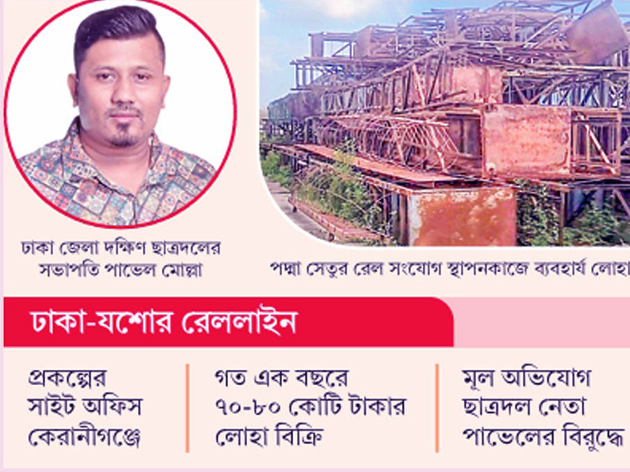 পদ্মা সেতুর ওপর দিয়ে ঢাকা থেকে যশোর পর্যন্ত রেললাইন নির্মাণ প্রকল্পের লোহা ও সরঞ্জামাদি চুরি করে বিক্রি করা হচ্ছে বলে অভিযোগ উঠেছে। গত এক বছরে ৭০-৮০ কোটি টাকার লোহা বিক্রির তথ্য পাওয়া গেছে।