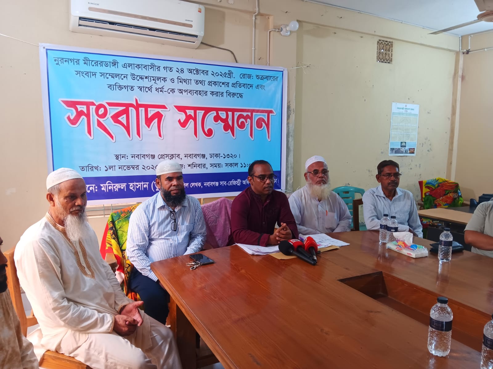 ঢাকার নবাবগঞ্জ উপজেলার বান্দুরা ইউনিয়নের নুরনগর মীরেরডাঙ্গী এলাকাবাসী উদ্যোগে গত ২৪ অক্টোবর আয়োজিত সংবাদ সম্মেলনে উদ্দেশ্যমূলক ও মিথ্যা তথ্য প্রকাশের প্রতিবাদে এবং ব্যক্তিগত স্বার্থে ধর্মকে অপব্যবহার করার বিরুদ্ধে এবার পাল্টা সংবাদ সম্মেলন করলেন দলিল লেখক মনিরুল হাসান তুষার। শনিবার (১ নভেম্বর) দুপুরে নবাবগঞ্জ প্রেস ক্লাবে এ সংবাদ সম্মেলনের অনুষ্ঠিত হয়।